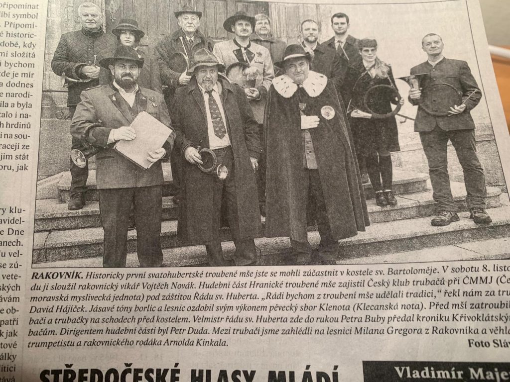Jsme hrdí na to, že u průlomu této (ne)tradice jsme stáli také my. Měli jsme tu čest být spolupořadateli první troubené Svatohubertské mše v chrámu sv. Bartoloměje. Pod vedením nestora české lovecké hudby Petra Dudy, jsme spolu s významnými osobnostmi našeho kraje předvedli, co lovecké žestě svedou. Mše se zúčastnil také Velmistr Řádu sv. Huberta, z jehož rukou přijali Křivoklátští trubači kroniku, která má nejen zmapovat trubačskou historii na Křivoklátsku, ale také pokládá pomyslný základní kámen tradici Svatohubertských troubených mší v našem kraji.