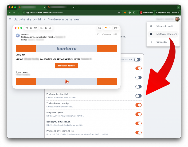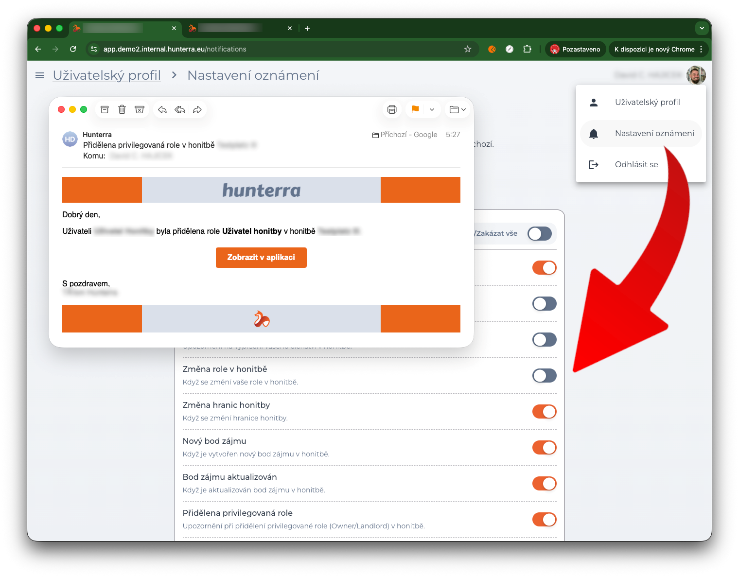 Plán lovu, vytvořený v HUNTERRA, se po odeslání uživatelem honitby ke schválení držiteli automaticky synchronizuje s E. M. A. Zpětná vazba o schválení se vrací přímo do HUNTERRA. Výsledek? Uživatel i držitel vidí stejná, aktuální data – každý ve svém systému. O všech krocích (vytvoření, odeslání, schválení, změny) jsou oba informováni notifikacemi, které lze libovolně nastavit.