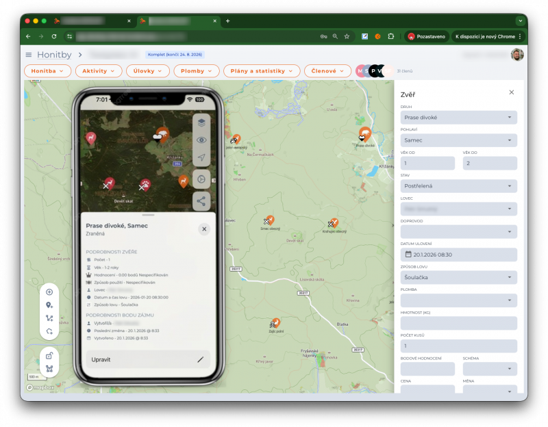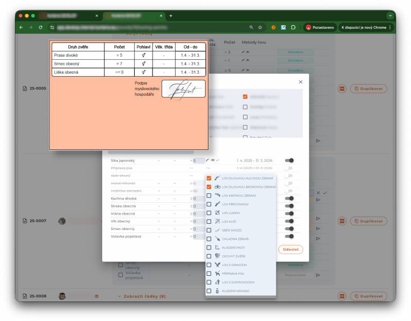 – evidenci a snadné generování povolenek k lovu (s kontrolou limitů, platnosti a historie),