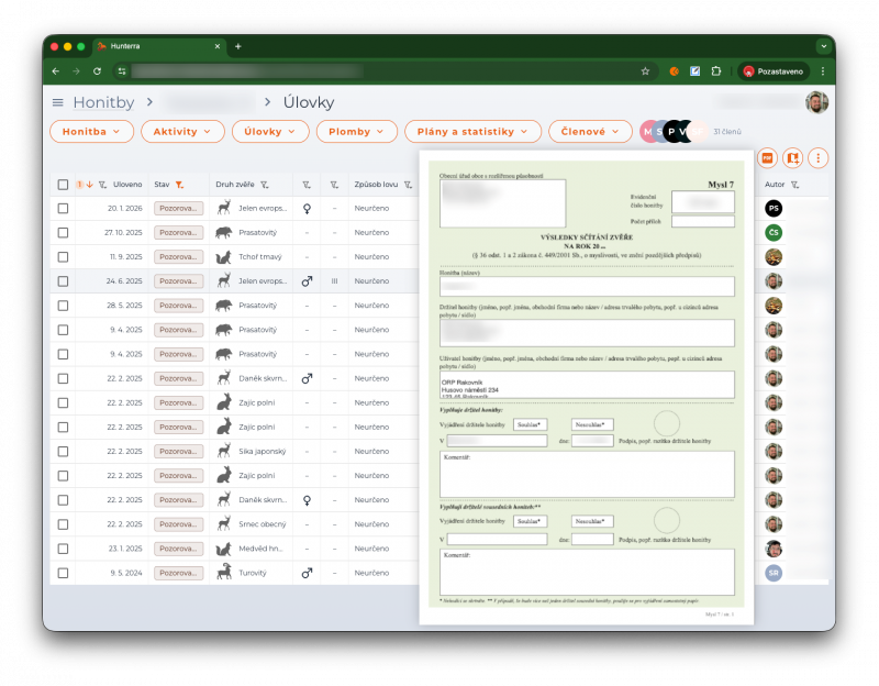 Plná evidence úlovků včetně všech detailů v pronajatých honitbách, možnost automaticky vygenerovat měsíční hlášení Mysl 8 pro SSM zůstává dostupná opět pouze v HUNTERRA – přehledně a na jednom místě.
