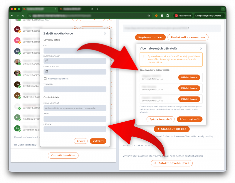 Systém okamžitě prověří, zda lovec již není registrován v HUNTERRA (podle loveckého lístku nebo e-mailu). Pokud najde shodu, nabídne seznam nalezených identit – stačí vybrat a přidat do honitby. Pokud ne, vytvoří se virtuální identita (tzv. Aligátor). Aby byli Aligátoři na první pohled odlišení od řádně registrovaných uživatelů, svítí u jejich avatara oranžový otazník „?“. Tím je vyřešena kompletní evidence lovců v honitbě a povolenek.